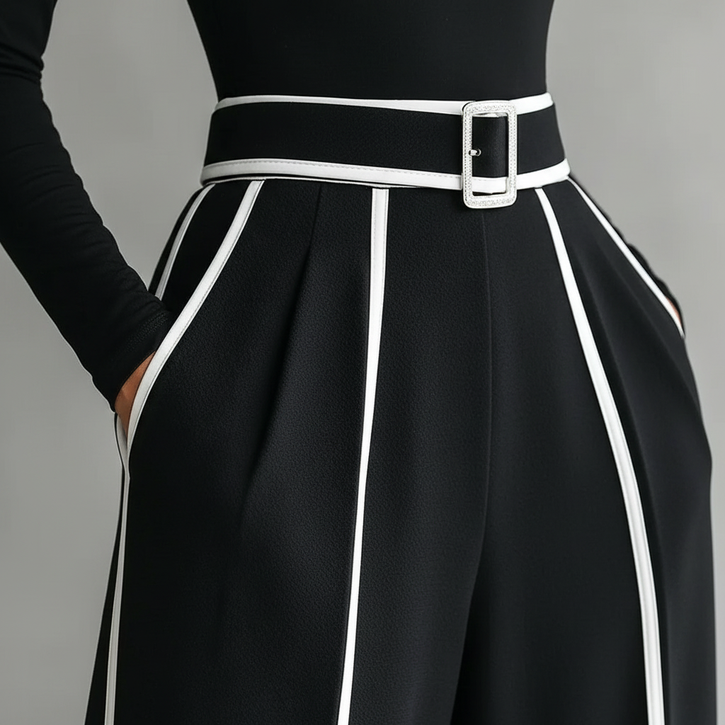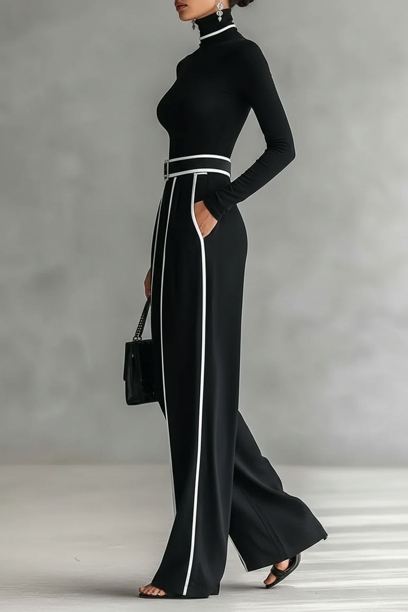 Conjunto de dos piezas con cuello alto y pantalón wide leg. La solución definitiva para un estilo retro-moderno sin esfuerzo.
